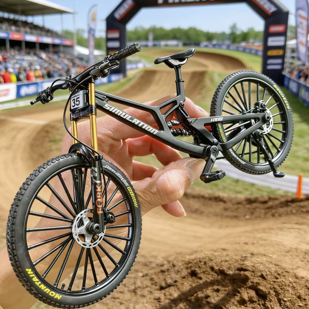 Selon le modèle que vous choisissez, il comprend un vélo de descente, d'enduro, de montagne ou de route miniature, doté de détails réalistes et de pièces mobiles telles que la suspension et la transmission .