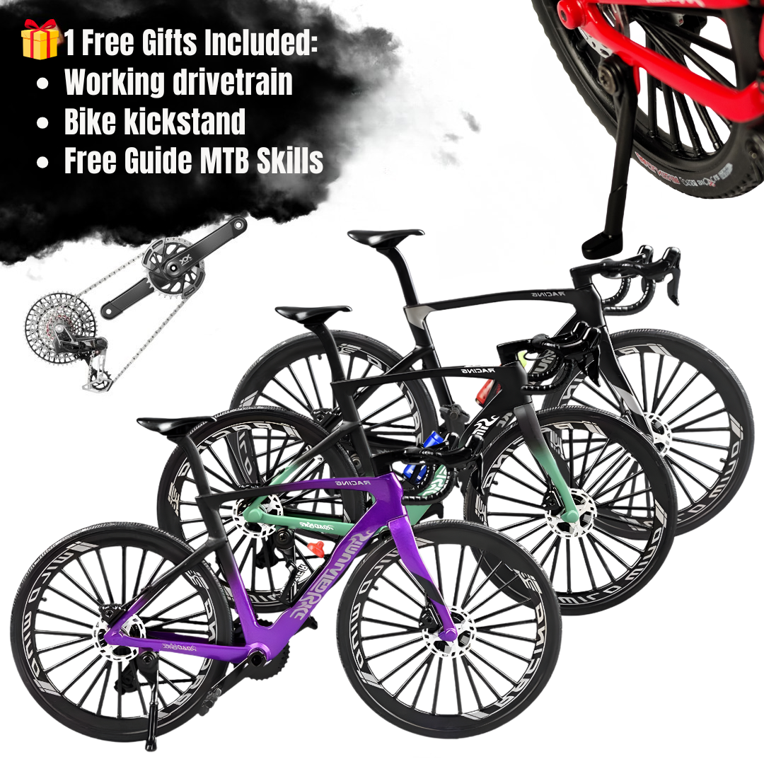 Depending on the model you choose, it includes a miniature downhill, enduro, mountain bike, or road bike, featuring realistic details and moving parts such as suspension and transmission.